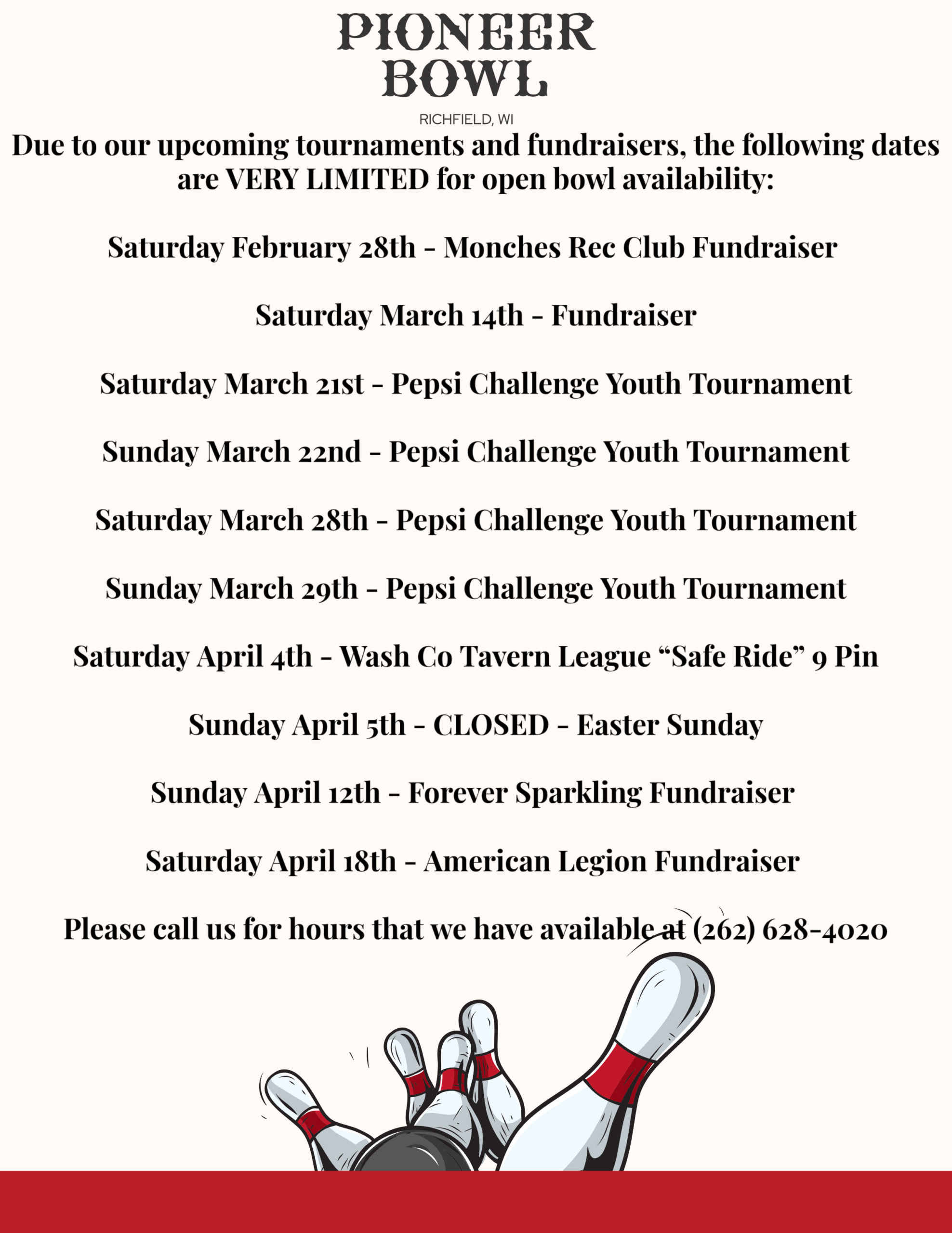 **PLEASE CALL & TALK TO PIONEER BOWL EMPLOYEE ABOUT WEEKEND BOWLING – THERE MAY BE A TOURNAMENT OR FUNDRAISER DURING THE DAY**